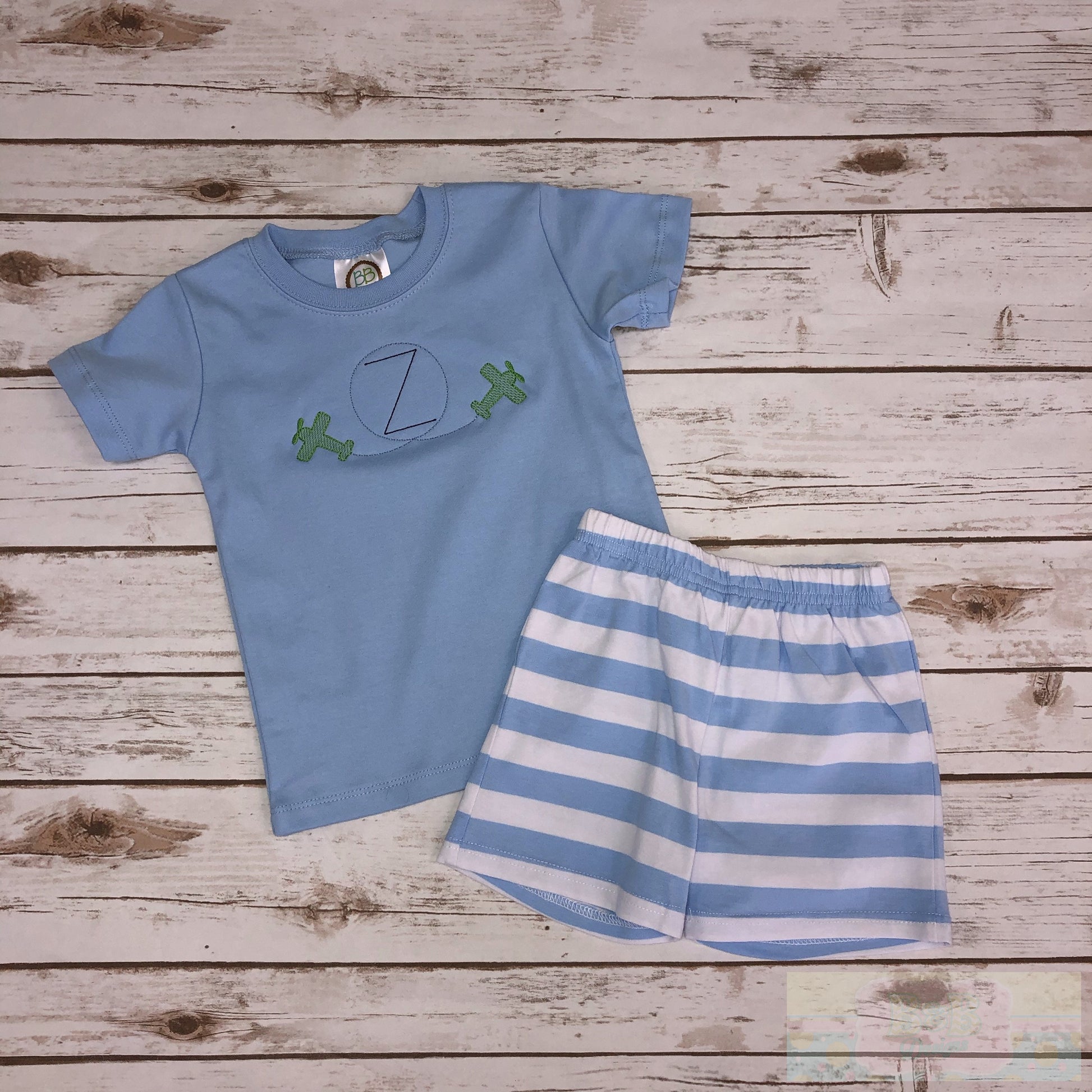 How adorable is this shorts set? This airplane embroidery design is so sweet and simple and perfect for wearing year-round. The striped shorts compliment the outfit.