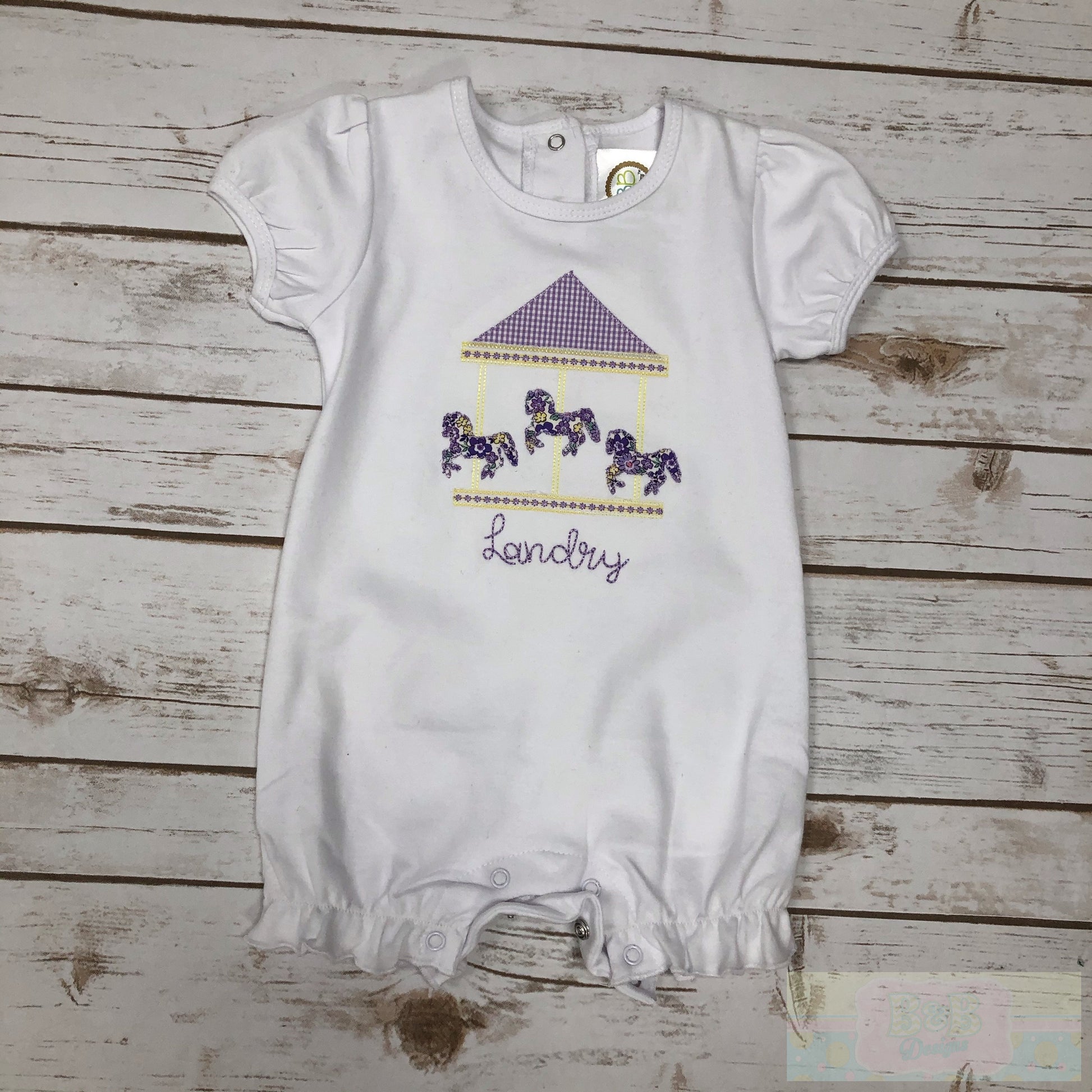 We are loving these short sleeve ruffle rompers! How adorable is this cute carousel outfit?!