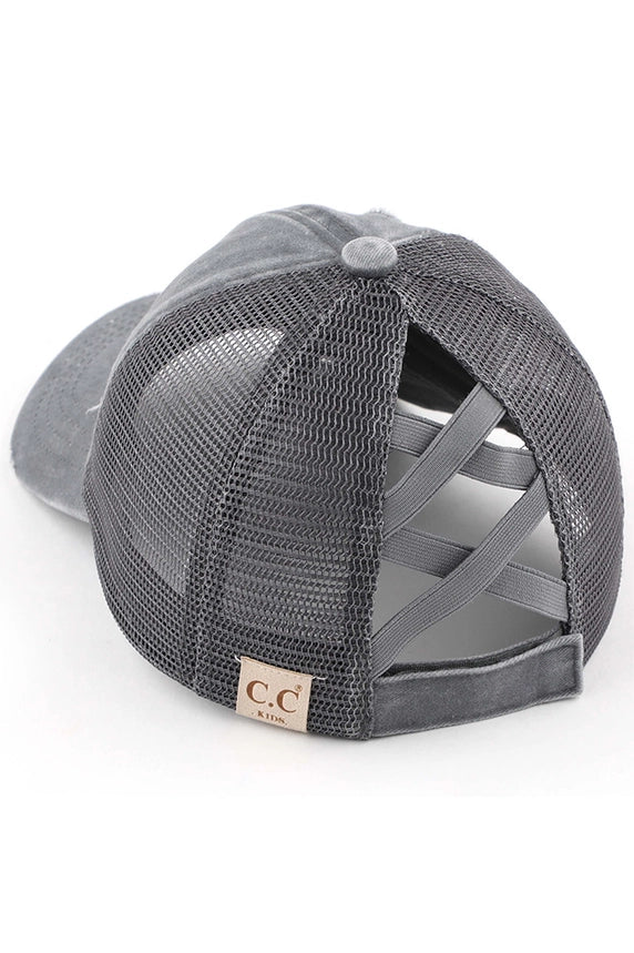C.C Washed denim mesh kids pony cap with crossed elastic band 100% Cotton One size