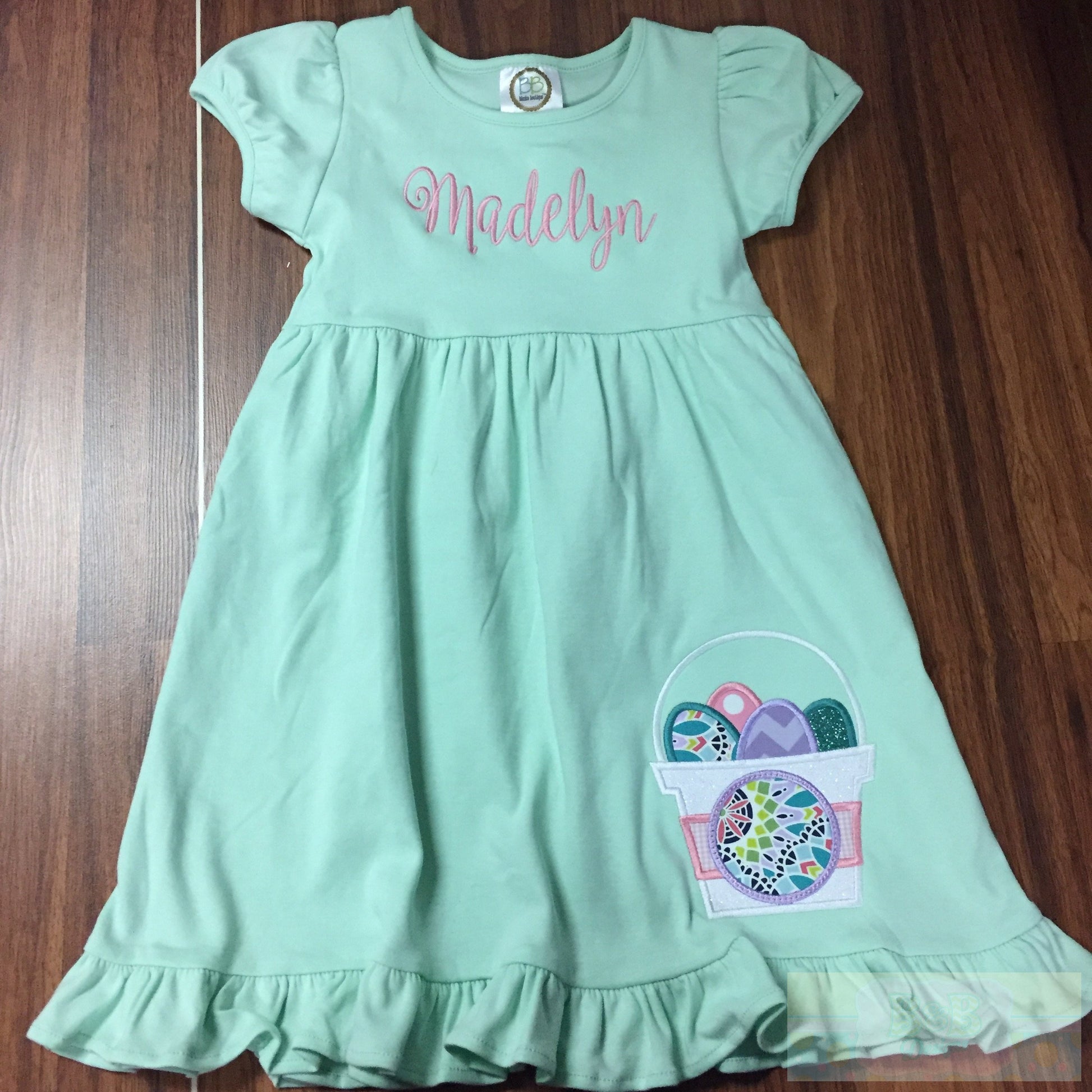 How adorable is this mint ruffled dress with the sweetest Easter Bucket appliqué!? Perfect for Easter Sunday!