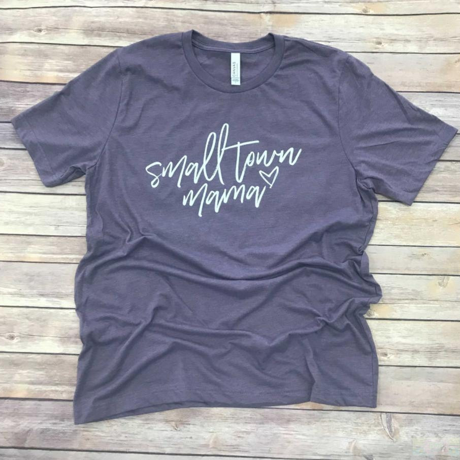 Small Town Mama's this is the shirt for you!! Design is shown on a Heather Purple Short Sleeve.