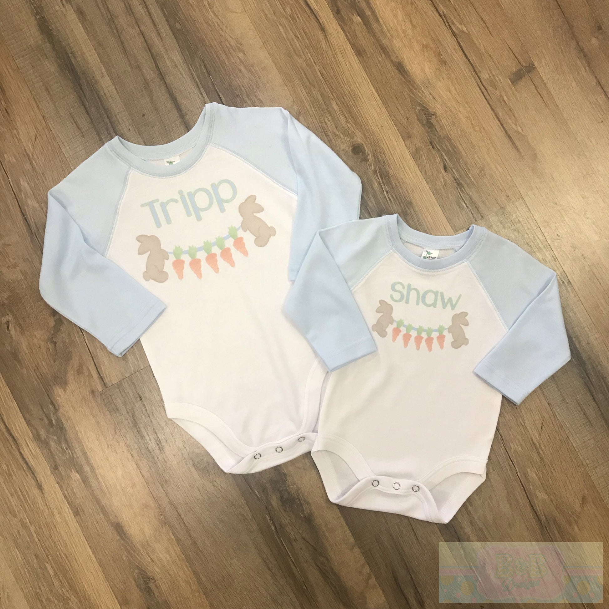 How adorable is this ringer onesie with the sweetest Easter Bunny design? Precious with pants or shorts for Easter egg hunting!