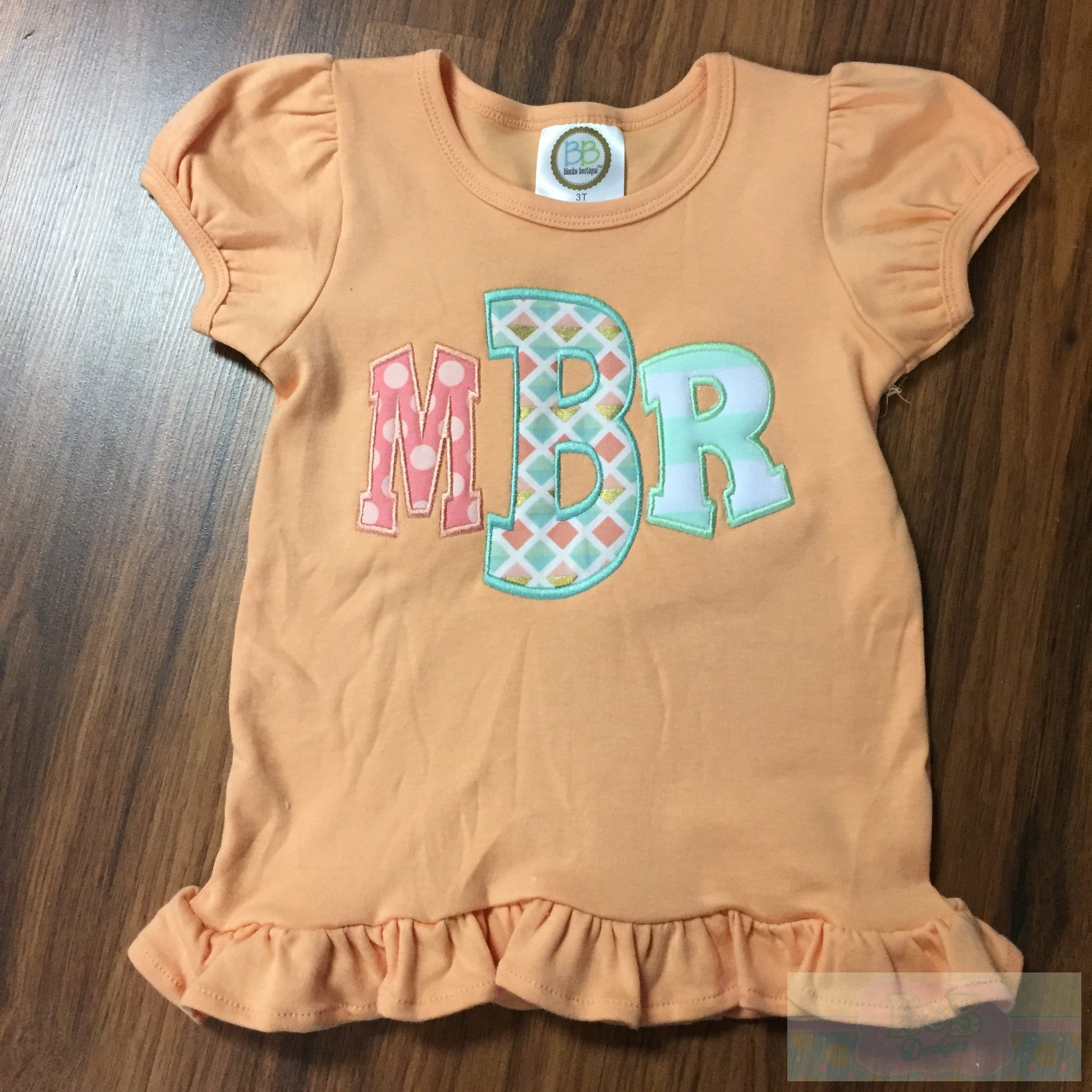 How adorable is this ruffled short sleeve shirt with the most adorable monogram applique? Precious with pants or shorts for wearing all spring and summer! Customize it with your child's initials.