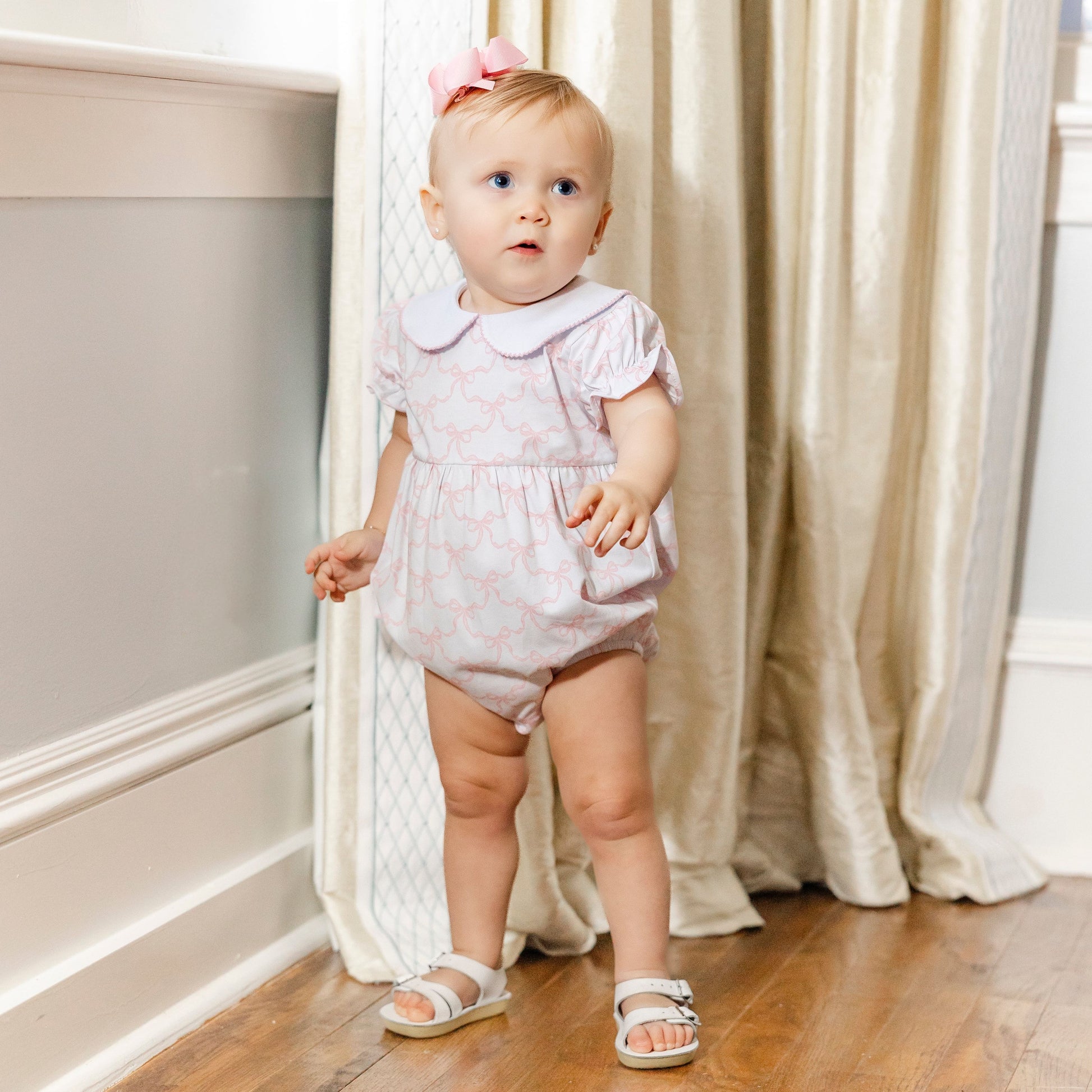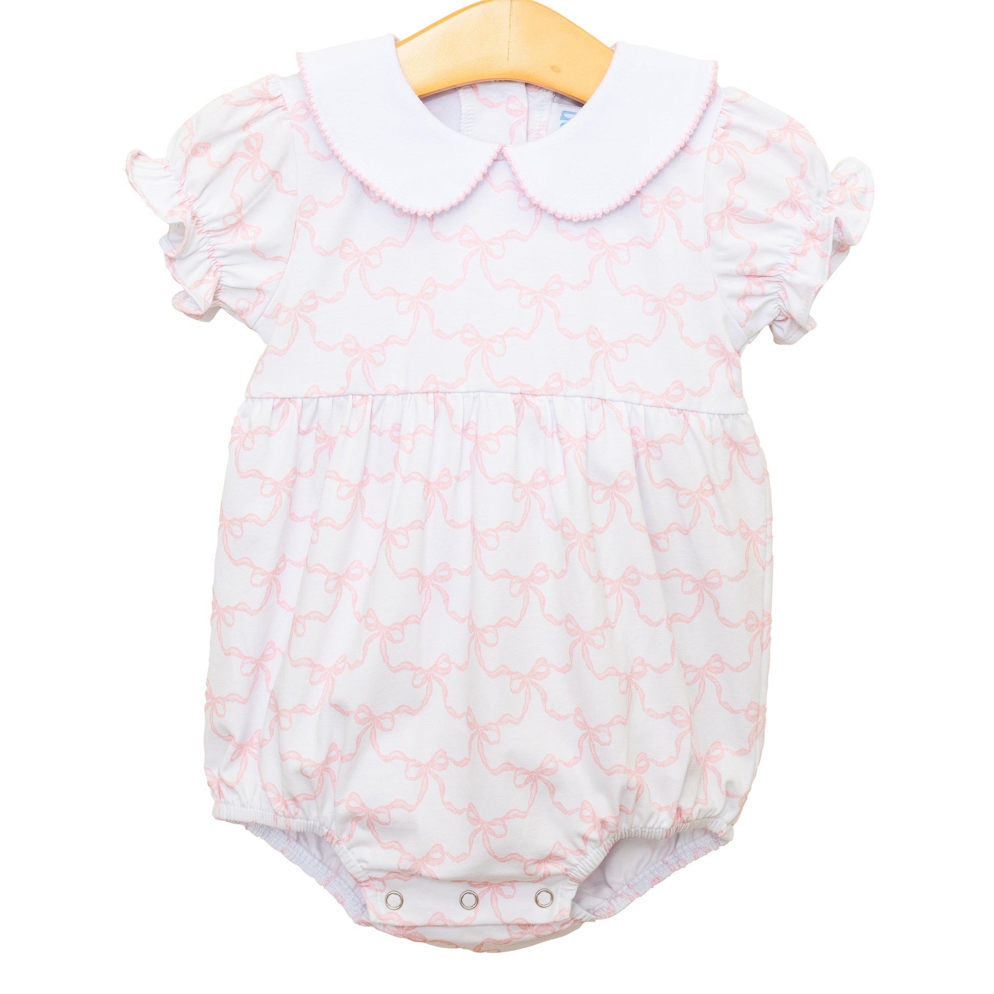 One of our best selling bubble is now available in this adorable pink trellis bow print. The playful Peter pan collar adds a charming detail to this dress. Perfect for any occasion, this bubble is sure to make you feel cute and carefree!