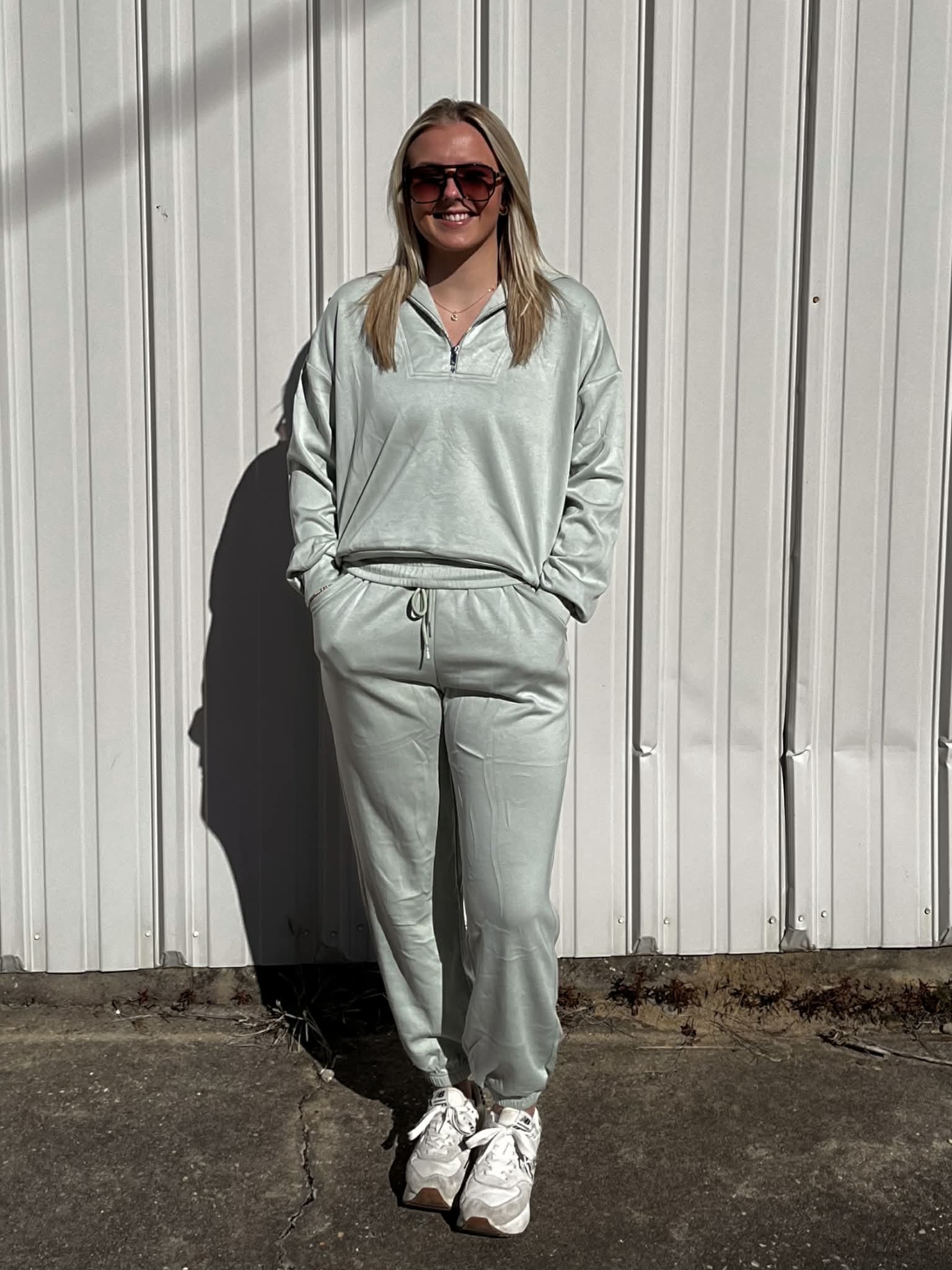 The muted seafoam tone brings a soft vibe that blends seamlessly into capsule wardrobes and styled displays. Ideal for dressing up with trucker hats and tote bags or dressing down with slippers, this set hits the sweet spot between on-trend and easygoing.