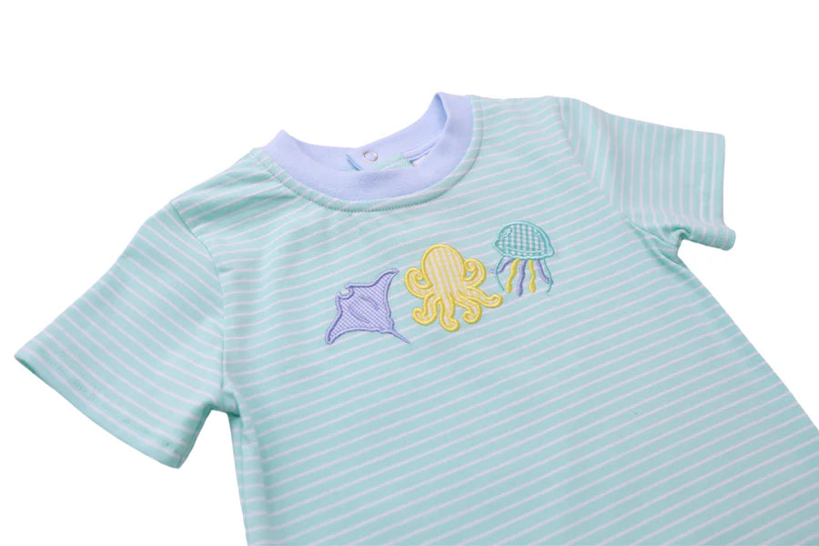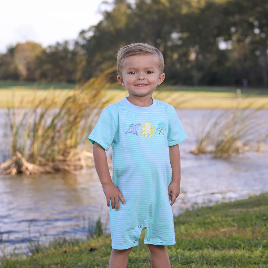 Ahoy Mate! This romper is cute for being out to sea or on the beach. The sea life romper is sure to have your little smiling with the appliques! Matching sibling options available. 95% Cotton 5% Spandex. Fits true to size.