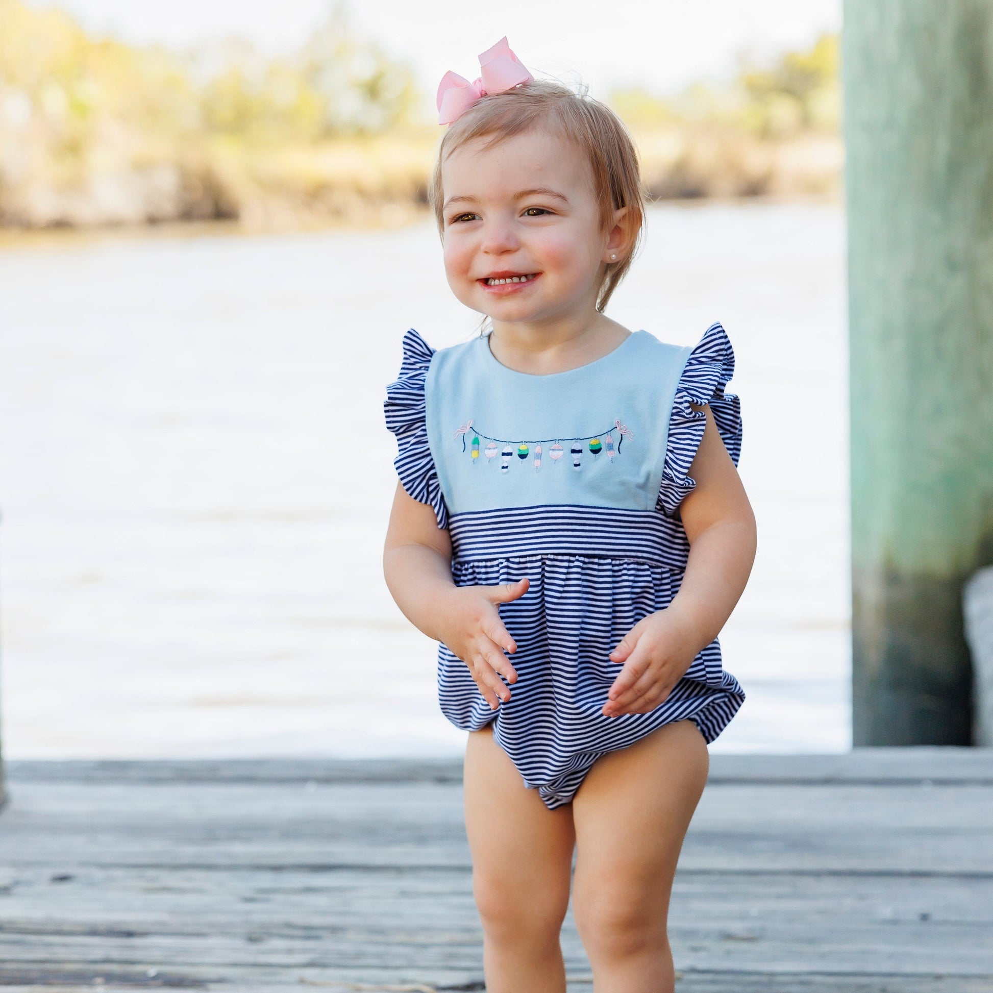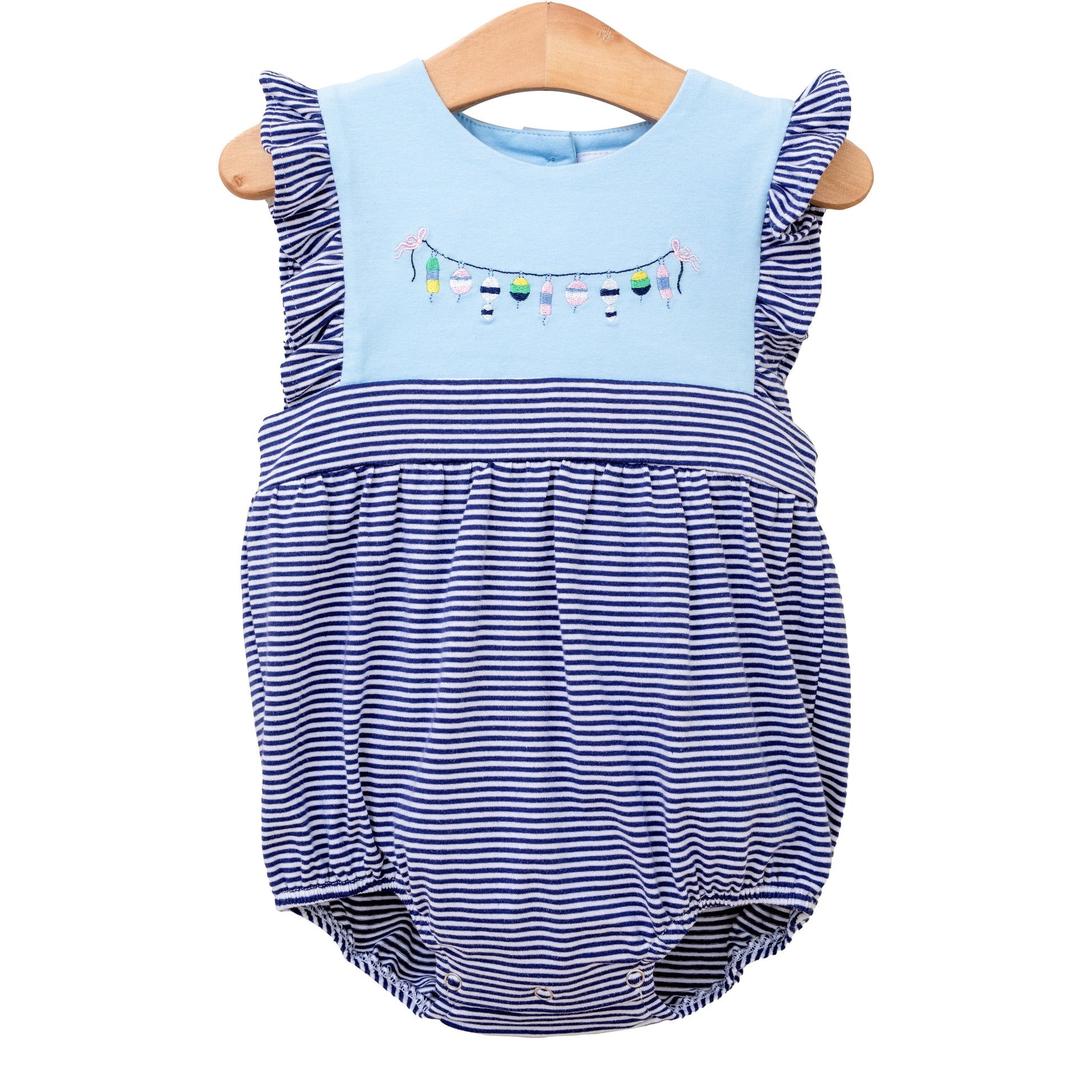 Reel in the compliments with our String of Buoys Ruffle Bubble. Featuring a playful ruffled sleeveless design and adorable buoys on a line embroidery, this bubble is perfect for a sunny summer day.